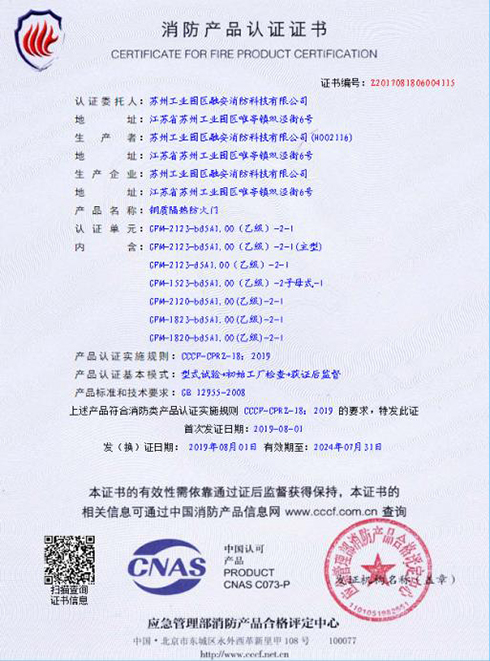 乙級鋼質(zhì)防火門消防產(chǎn)品認(rèn)證證書